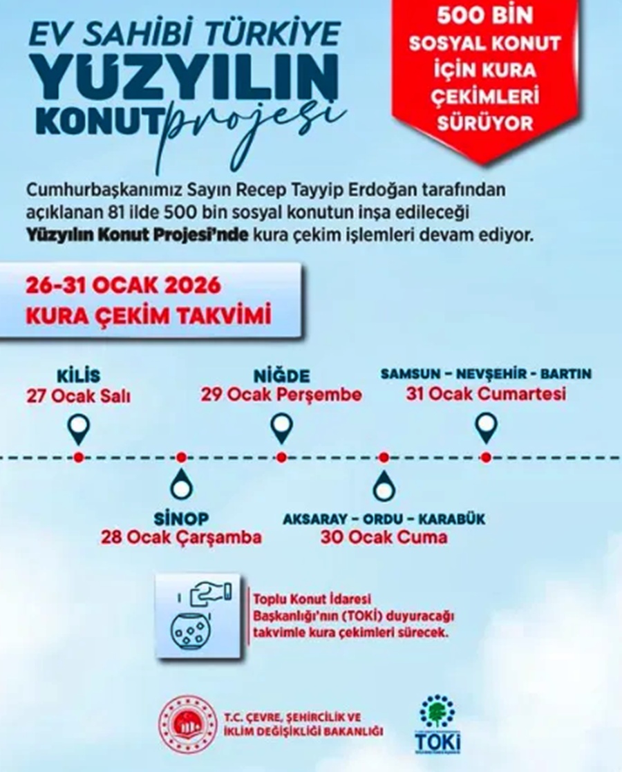 Çevre, Şehircilik ve İklim Değişikliği Bakanlığı, ülke genelinde yürütülen TOKİ 500 bin sosyal konut projesinde hak sahiplerini belirleyecek kura tarihlerini açıkladı. Vatandaşlar, kısa süre içinde yeni konutlarına kavuşmanın heyecanını yaşayacak.