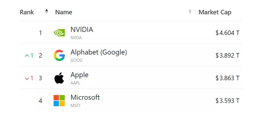 Piyasa sıralamasının zirvesinde ise yaklaşık 4,6 trilyon dolarlık değeriyle Nvidia bulunuyor. Onu Alphabet takip ederken, Microsoft yaklaşık 3,5 trilyon dolarlık piyasa değeriyle dördüncü sırada yer alıyor.