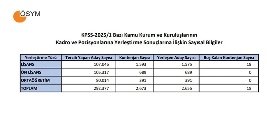 KPSS 2025/1 tercih süreci, 10-17 Temmuz tarihleri arasında tamamlanmıştı. Sonuçlara göre lisans, ön lisans ve ortaöğretim mezunlarından toplam 292 bin 377 aday başvuru yaparken, 2 bin 655 kişi tercih ettiği kadrolara yerleşti. Lisans düzeyindeki kontenjanlarda ise 18 kişilik boş kadro kaldığı bildirildi.