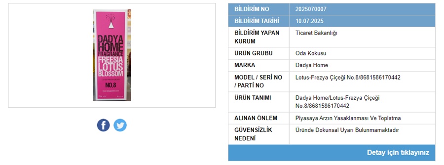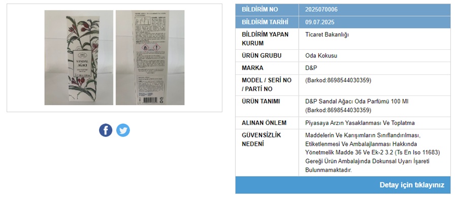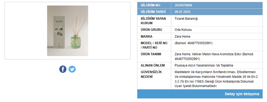 Bakanlığın 9, 10 ve 11 Temmuz 2025 tarihlerinde yaptığı duyurulara göre Zara Home’un Vetiver Melon hava aromatize edici ürünü, D&P markasına ait Sandal Ağacı oda parfümü, Dadya Home’un Lotus-Frezya Çiçeği kokusu ile Royal marka Beyaz Sabun esanslı çubuklu oda kokusu için piyasaya arzın yasaklanması ve toplatma işlemleri başlatıldı.
