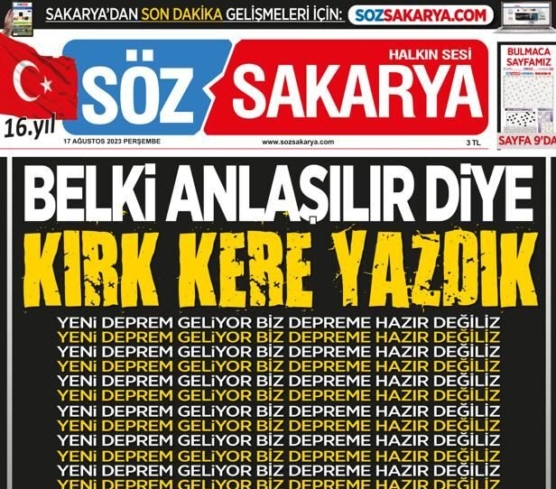 Sakarya’nın yerel gazetelerinden biri olan ‘Söz Sakarya’ gazetesi depremin 24. yılında dikkat çekmesi için tepkisini manşet ile dile getirdi.