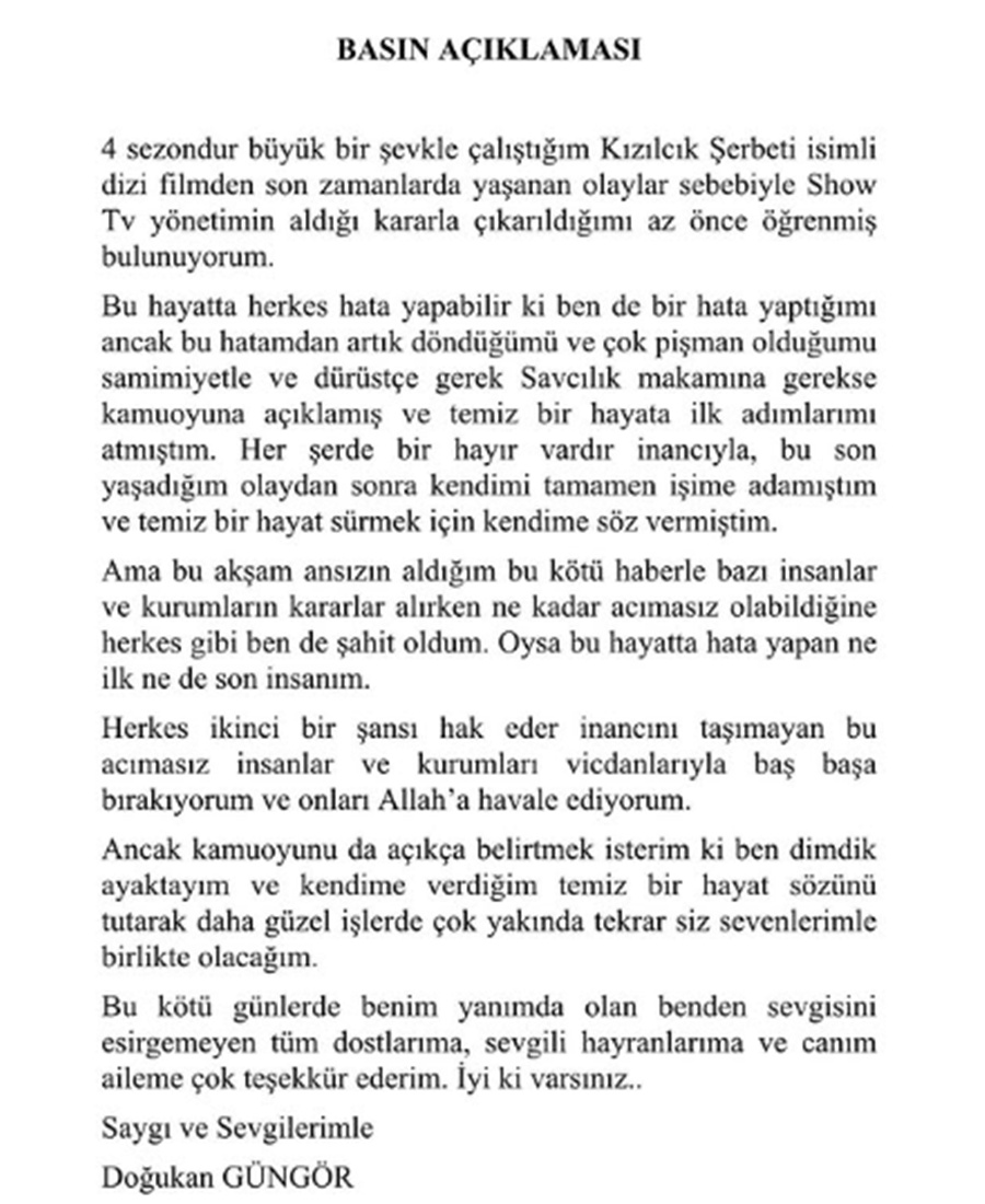 Diziden çıkarılması ve test sonuçları ile ilgili Doğukan Güngör şu açıklamayı yaptı: