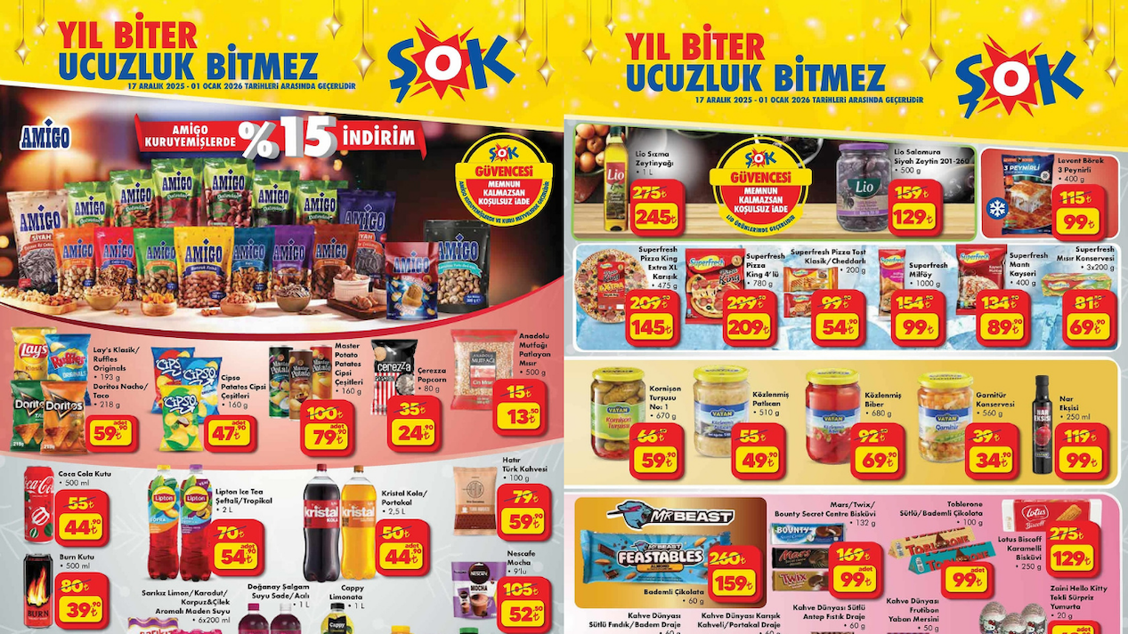 17 Aralık 2025-1 Ocak 2026 tarihleri arasında geçerli olacak yılbaşı indirimine ilişkin yeni aktüel kataloğunu paylaşan ŞOK, tüketicilerin yüzünü güldürdü. ŞOK, bu tarihlerde, pek çok farklı kategorideki ürünlerin indirimli olarak raflardaki yerini alacağını duyurdu.
