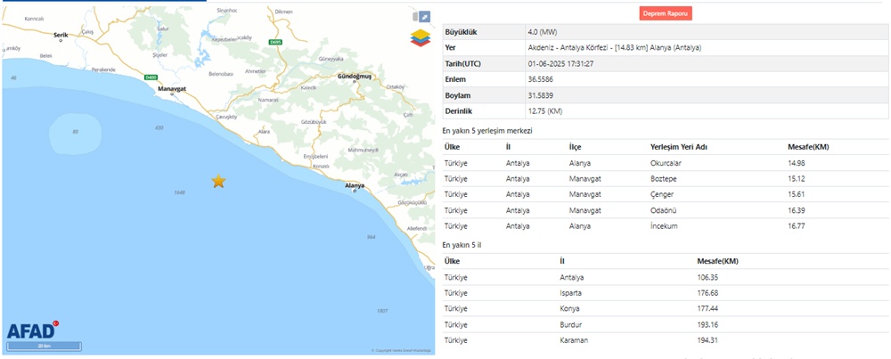Akdeniz açıklarında, Antalya’nın Alanya ilçesine yakın bölgede 1 Haziran 2025 günü saat 17.31’de 4.0 büyüklüğünde bir deprem meydana geldi. Afet ve Acil Durum Yönetimi Başkanlığı (AFAD) tarafından paylaşılan verilere göre sarsıntının merkez üssü Antalya Körfezi’nde, Alanya’ya yaklaşık 14.8 kilometre mesafede bulunuyor.