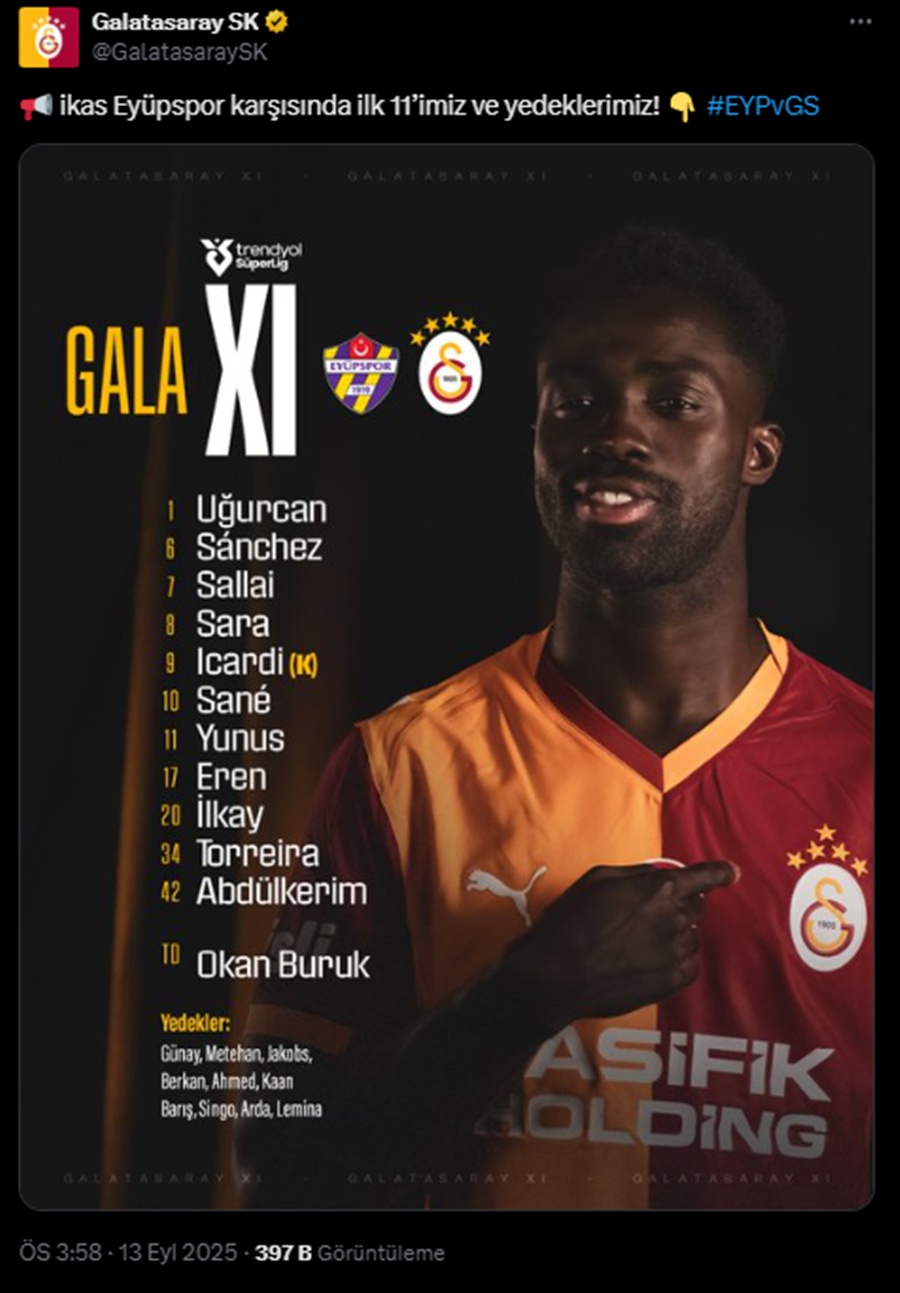 Trendyol Süper Lig’in 5. haftasında Galatasaray, Eyüpspor deplasmanına çıkıyor. Atatürk Olimpiyat Stadyumu’nda oynanacak maç öncesinde her iki takımın da ilk 11’leri belli oldu.